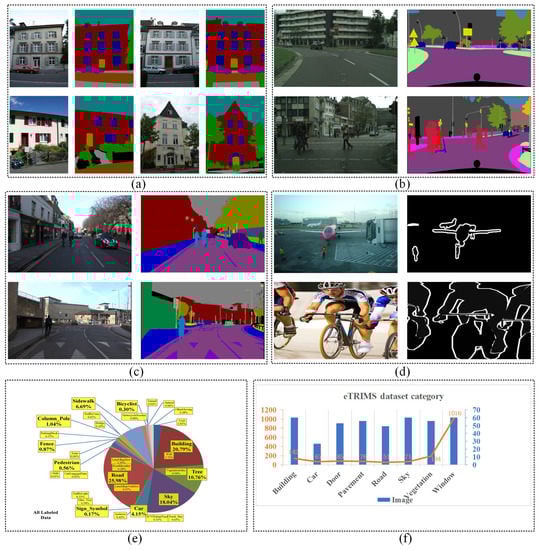 The open source benchmarks used in our paper for experimental evaluations. Subfigures (a–d) are part of benchmarks randomly selected from eTRIMS [], Cityscapes [], CamVid [] and PASCAL VOC 2012 [], respectively. Subfigure (e) [] and (f) are the distributions of different object categories in CamVid and eTRIMS datasets, respectively. Each bar in (f) displays the number of images belonging to each category, while the curved orange line represents the object numbers within each class in the eTRIMS dataset.
