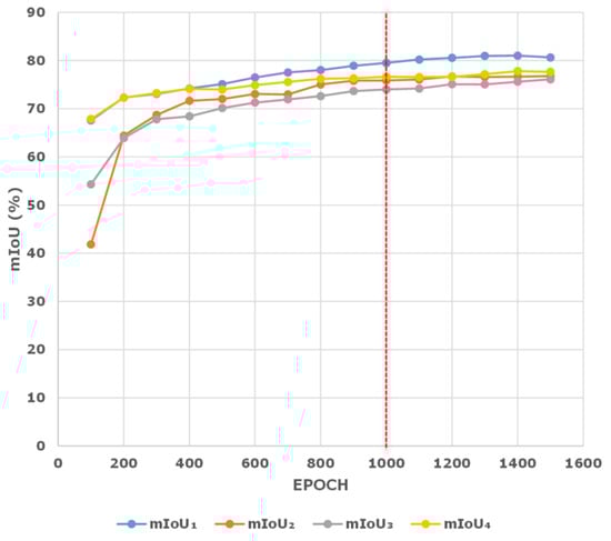 In Table 1, two parameters, namely loss weight factor and the training epoch Epoch are sensitive to extreme values. In our paper, we achieve statistically accurate results by repeatedly conducting experiments using different values of Epoch and to obtain the optimized values in the eTRIMS dataset. As shown in Figure 6, it can be observed that the mIoU of the validation set basically gives better results at around 1000 epochs. If we continually increase the epoch values, the polylines become saturated with a narrow margin of mIoU improvement, which implies that the training epochs at around 1000 is indeed a good balance between predicted performance and training efficiency.