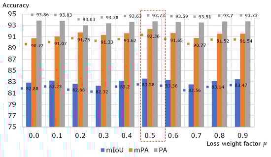 To further improve the segmentation accuracy of the EDPNet, the auxiliary loss was added to enhance the training efficiency. The effects of different values of loss weight factor on the segmentation results are displayed in Figure 7, where takes values in the range from 0.0 to 0.9. It can be observed that extremely large or small values of may decrease the accuracy of the network. By trial-and-error experiments, we found that the value of 0.5 can best balance auxiliary loss and main loss as the highest accuracy of 83.58% mIoU can be achieved. Note that the results in Figure 7 were obtained when the eTRIMS dataset was trained at 1000 epochs and pre-loaded with weights trained on ImageNet. All subsequent experiments were conducted with = 0.5 as a fixed parameter.