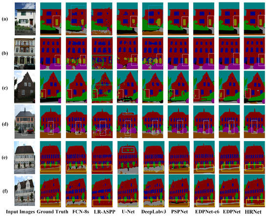 Semantic segmentation results obtained by seven different networks on the eTRIMS test set. The represented buildings depicted in subfigures (a–f) were selected from the eTRIMS dataset.