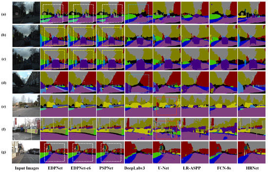 The qualitative prediction results are shown in Figure 9. Among these eight models, the segmentation results obtained by DeepLabv3 and U-Net are coarse at the edges, which is demonstrated in the blue rectangles in the last two columns in Figure 9. The segmentation results of PSPNet, EDPNet-c6, and EDPNet are more accurate overall, but the EDPNet model outperforms others in identifying the window positions, as depicted in the white rectangles in Figure 9a,b. This is because the 4-fold downsampling of the ‘DC’ module in the EDPNet retains more spatial information, which in turn supplements the semantic details as well as feature information lost during iterative learning of the network. In addition, the segmentation results of the EDPNet have more sharp and clear edges and less over- and/or under-segmentation compared to the PSPNet model, as is evident in the white rectangles in Figure 9c–e. Besides, from the roadside railing in the yellow rectangles in Figure 9f, it can be seen that the EDPNet obtains more complete and sharp results for these small-sized objects. In short, through the visualization results on the Cityscapes validation set, EDPNet shows its advantages in acquiring semantic information and maintaining spatial details of urban street scenes.