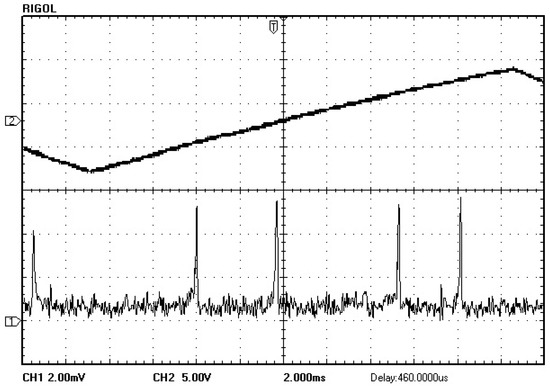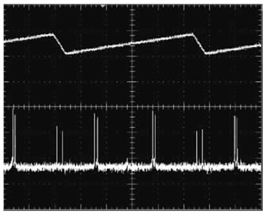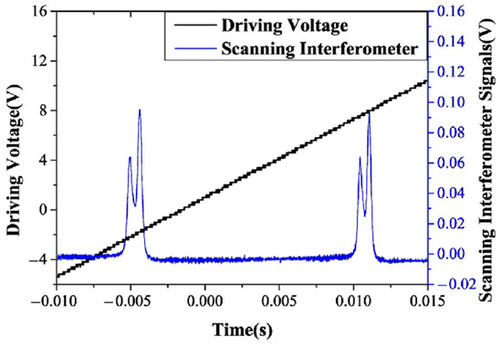 Oscillating spectrum of dual-frequency laser (blue trace) and triangular-wave voltage (black trace) [29].