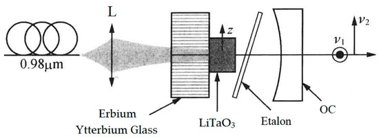 Schematic diagram of dual-frequency erbium–ytterbium glass laser [27]. L: lens; OC: output coupler.