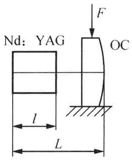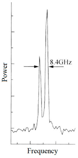 In 2003, the research group of Prof. V. G. Gudelev of the National Academy of Sciences of Belarus reported a diode-pumped tunable dual-frequency Nd:YAG laser at 1064 nm with coupled resonators [28], as shown in Figure 17. The coupled resonators consisted of the two sides of the Nd:YAG crystal and the spherical output coupler of OC, and the fundamental cavity formed by the left side of the Nd:YAG crystal and the OC was forced to oscillate in either single-longitudinal mode or two longitudinal modes, depending on the geometrical cavity length of L. On the one hand, in the circumstance of single-longitudinal-mode oscillation, the laser mode was split due to the intracavity stress birefringence induced by the applied force of F to the OC element; therefore, an orthogonally and linearly polarized dual-frequency laser at 1064 nm was obtained, and the frequency difference was continuously tuned in a range from 50 MHz to 2.4 GHz when changing the applied force. The oscillating-mode spectrum of the dual-frequency laser with different frequency difference was observed experimentally, as shown in Figure 18. On the other hand, in the circumstance of two-longitudinal-mode oscillation of the fundamental cavity, each mode was split into two orthogonally and linearly polarized modes when the applied force existed, the mode-splitting magnitude increased with the applied force. When the mode splitting magnitude reached to a certain value, the system output a beam of orthogonally and linearly polarized dual-frequency laser at 1064 nm, the maximum frequency difference of which being 8.4 GHz, as shown in Figure 19.