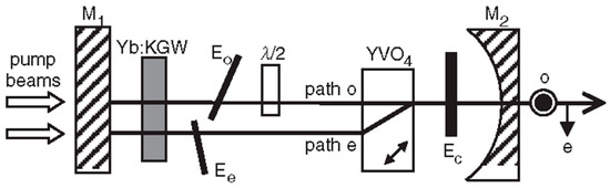 Schematic diagram of dual-frequency Yb:KGW laser [32]. Eo, Ee, Ec: etalon; M1: plane-dichroic mirror; M2: output coupler.
