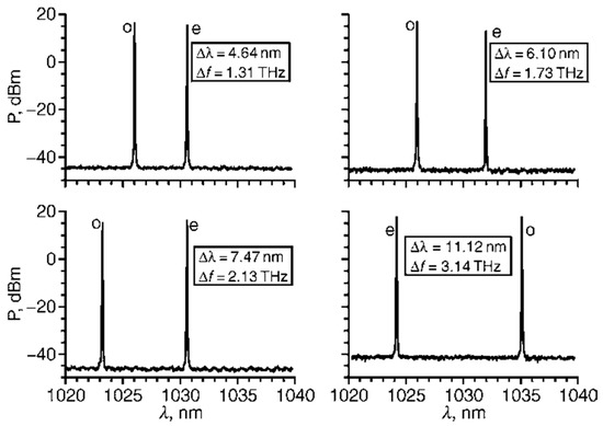 Compared to the crystal-quartz-made BFPE described above, an electro-optical birefringent F-P etalon (EO-BFPE) can also be used as not only the single-longitudinal-mode selector but also as the splitter of the laser-longitudinal mode. On this foundation, in 2007, the research group of Julien Le Gouet of Thales Research & Technology, France, reported an electro-optical birefringent dual-frequency Nd:YAG laser [25], as shown in Figure 11, in which a 400 μm-thick EO-BFPE made from lead zirconate tantalate ceramic was included in the laser cavity with an optical length of 14 mm. As a result, an orthogonally and linearly polarized dual-frequency laser at 1064 nm was obtained, and the frequency difference was discontinuously tuned in a range from 10 to 127 GHz when the direct voltage applied to the EO-BFPE was changed from 0 to 499 V. The typical oscillating spectrum of the dual-frequency laser with different frequency difference was observed experimentally, as shown in Figure 12.