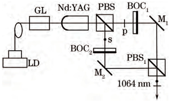 Schematic diagram of dual-frequency Nd:YAG laser system at 1064 nm [35]. LD: laser diode; GL: gradient-index lens; PBS: polarizing beam splitter; BOC: birefringent output coupler; M: mirror.