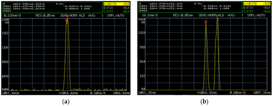 Moreover, a diode-pumped TCDFL with a tunable and large frequency difference at 1064 nm was designed and investigated [36], as shown in Figure 28. Both cavities included a birefringent filter of PBS-BC, in which the birefringent crystal (BC) was a piece of a half-wave plate with a thickness of 0.7 mm. The p-polarized and s-polarized components of the laser at 1064 nm were forced to oscillate simultaneously in single-longitudinal mode in the linear and right-angle cavities, respectively. As a result, an orthogonally and linearly polarized dual-frequency laser at 1064 nm was obtained, and the oscillating-mode spectrum was observed experimentally by the use of a confocal scanning Fabry–Perot interferometer, as shown in Figure 29.
