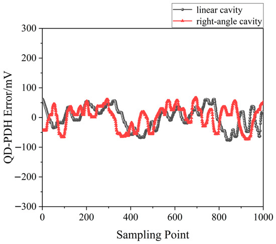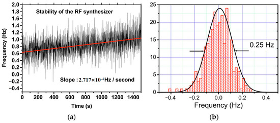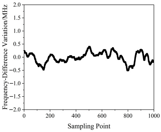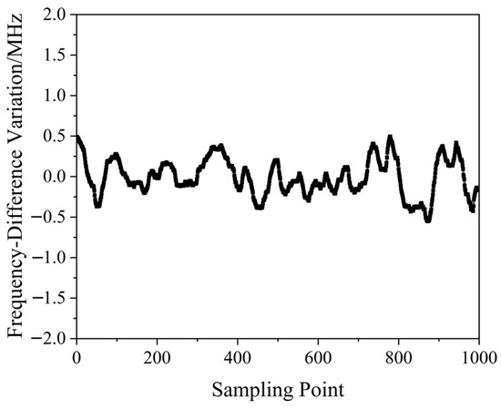 A QD-PDH frequency-difference-stabilizing system for the same diode-pumped TCDFL with a frequency difference of 24 GHz at 1064 nm was established and investigated. Both frequencies of the TCDFL at 1064 nm were successfully frequency-stabilized to the two different resonant frequencies of the referenced F-P cavity during a period of about 1 h, the error signals of the two QD-PDH frequency-stabilizing subsystems were obtained experimentally, as shown in Figure 43, the maximum offset voltages of the QD-PDH error signals were equal to 84.5 mV and 76.7 mV, respectively, and correspondingly, the laser-frequency drifts of the linear and right-angle cavities were determined to be <0.34 and 0.35 MHz, respectively. The frequency-difference fluctuations of the frequency-locked TCDFL are shown in Figure 44, and the maximum change in the frequency difference was <0.51 MHz. According to the Allan variance, the laser-frequency stabilities of the linear and right-angle cavities were better than 1.6 × 10−11 and 2.0 × 10−11, respectively, corresponding to a frequency-difference stability better than 2.9 × 10−7.