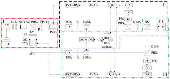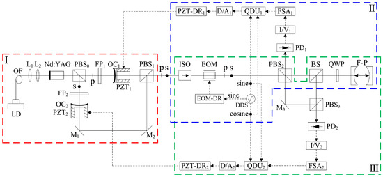 In 2022, our group reported a frequency-difference-stabilizing system for the diode-pumped TCDFL at 1064 nm using a double-modulator QD-PDH frequency-stabilizing method [43], as shown in Figure 39, which included two sets of QD-PDH frequency-stabilizing subsystems (see parts II and III) that shared the same F-P cavity as the frequency reference, and the magnitude of the frequency difference was required to be an integer number representing times of the free spectral range (FSR) of the referenced F-P cavity.