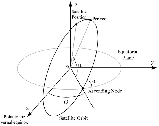 The position of a satellite in space can be represented by classical orbital elements. In this paper, we are concerned about the true anomaly, ν, and the longitude of the ascending node, Ω. Since the satellite orbit is circular and the periapasis cannot be calculated, the phase angle, u, is used as a substitute parameter for the true anomaly, which represents the angle between the satellite and ascending node. The at time t, is given by , where is the initial longitude of the ascending node and is the rotational angular velocity of the Earth. The remaining elements, inclination, α, and semi-major axis, a, are constants of the constellation. The semi-major axis, a, is equal to the radius of the orbit, which is the sum of the orbit’s altitude, h, and the radius of the Earth. A schematic diagram of satellite orbit parameters is shown in Figure 1.