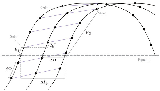 The spacing between adjacent planes is specified by the right ascension difference of ascending nodes , and the phase difference between adjacent satellites in an orbital plane , can be calculated by the number of satellites in each orbit. Finally, due to the existence of the phase factor, F, in the constellation parameters, the latitude of two horizontal neighbor satellites located in adjacent orbits are different, and the difference value is expressed as phase offset, . A visualization of the above constellation parameters can be seen in Figure 2. Meanwhile, the satellite numbered can be represented by these parameters as , where is a normalized function ensuring that its result is in the interval .