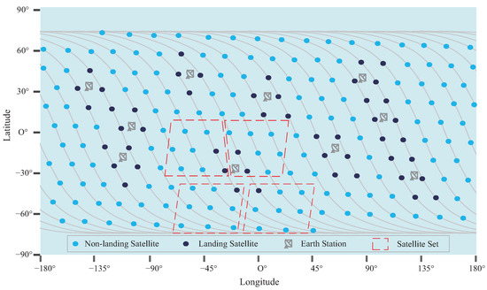 The purpose of the matching strategy is to assign one or more landing satellites to each satellite, and the landing satellite establishes a connection with the ground station through a feeder link, at the current time. When the satellite receives an internet access request from a ground-based user, it sends the data directly to a matching landing satellite. Users will be connected to the ground core network through the feeder link of the landing satellite. The purpose of this approach is twofold: first, minimize the hop number of satellite network packets to reduce the internet access delay and avoid packet loss caused by unstable ISLs; second, greatly reduce the complexity of the routing algorithm. Each set of satellites includes several non-landing satellites and landing satellites, as shown in Figure 3. Note that, for the sake of brevity, only the satellites in ascending orbit are shown in this figure.