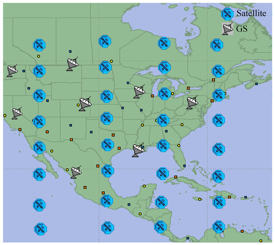 We referenced the constellation parameters of first shell in Starlink’s initial deployment and built a Walker-Delta constellation to evaluate the algorithm’s performance. The specific parameters of the constellation are: 53.0:500/20/11, and the orbital altitude is 550 km. The constellation diagram, in the simulation software OPNET, is shown in Figure 4. Each satellite node moves according to the defined orbital parameters, and when it runs within the visible range of the ground station, it can establish a feed link with the ground station and become a landing satellite. At the same time, in order to simulate the traffic differences due to geographical factors, we divide the world into several square grids, each grid is assigned a traffic weight, based on population density and development level. The traffic generated by the traffic model, multiplied by the weight of the region, is the real traffic of users accessing the satellite network in this region.