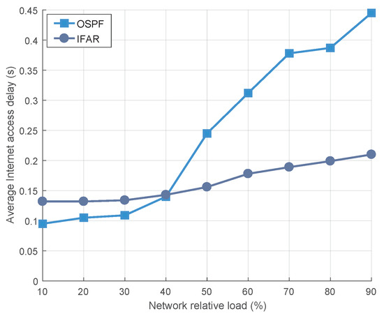 We conducted experiments under varying network relative loads, as illustrated in Figure 6. The average internet access delay is defined as the average delay between the packet sent from the user terminal to the satellite network and successfully downloaded from the satellite network to the terrestrial server. Our findings revealed that when the network load is light, the OSPF algorithm outperforms the IFAR algorithm, in terms of delay performance. This can be attributed to the fact that the IFAR algorithm rapidly transmits data to the ground station and subsequently accesses the server through ground optical fiber, while the OSPF protocol first forwards data packets to the ground station closest to the server through the ISLs, before accessing the server. As a result, data forwarded by the OSPF algorithm travels a longer distance in space. Because the speed of light in space is 40% faster than the speed of light in optical fiber, packets can travel faster on satellite networks than on the ground, when there is no congestion.