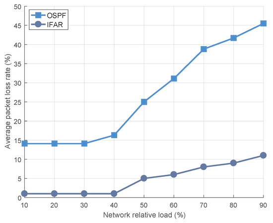 When the network load is low, the OSPF algorithm resorts to forwarding packets on the ISL through multiple hops, thereby compounding the packet loss rate and resulting in a high average network packet loss rate. In contrast, the IFAR algorithm relies on the stable and resource-rich ground network to forward more packets, effectively circumventing packet loss caused by the instability of ISLs. As the network load increases, the satellite network becomes increasingly congested, and the packet loss rate of both algorithms starts to rise. This is because the OSPF algorithm discards a substantial amount of packets, that either exceed their lifetime limits or the cache capacity is insufficient. The IAFR algorithm can only transmit data between matching satellites, avoiding long-distance transmission by ISLs, and meeting the needs of users for fast access to the internet.