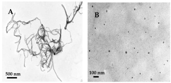The morphologies of MWCNTs and HFs were obtained by TEM. MWCNTs were curved tubes with a diameter of about 10–20 nm. According to the literature, the size of monomolecular HFs is about 1 nm []. Figure 2B showed the HFs were a near-spherical shape with an average size of about 20 nm, which may be due to the fact that HFs had cohesive hydrogen bonds and were easy to aggregate in aqueous solution [,,]. HFs aggregates can form complexes with GOD [], which may promote the electron transfer of protein sites and the conductivity of HFs and improve the catalytic ability of GOD.