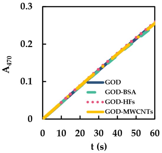 In Figure 3, the slopes of GOD, GOD-BSA, GOD-HFs, and GOD-MWCNTs had little change. The ICRR of GOD, GOD-BSA, GOD-HFs, and GOD-MWCNTs were all converted to 0.2 μM s−1. Thus, BSA, HFs, and MWCNTs hardly affect the ICRR of GOD, which may be due to the good biocompatibility of BSA, HFs, and MWCNTs with GOD.