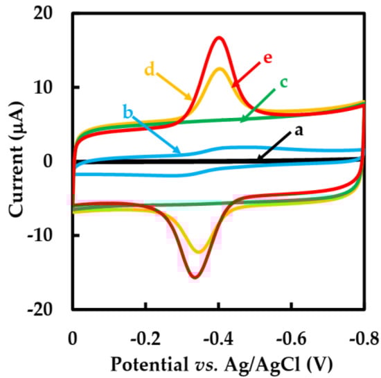CVs of different modified GCEs: (a) bare GCE, (b) NF-GLA/GOD/GCE, (c) NF-GLA/MWCNTs-BSA-HFs/GCE, (d) NF-GLA/BSA-HFs-GOD/GCE, and (e) NF-GLA/MWCNTs-BSA-HFs-GOD/GCE in N2-saturated 50 mM phosphate-buffered solution (pH 6) at a scan rate of 0.05 V·s−1.