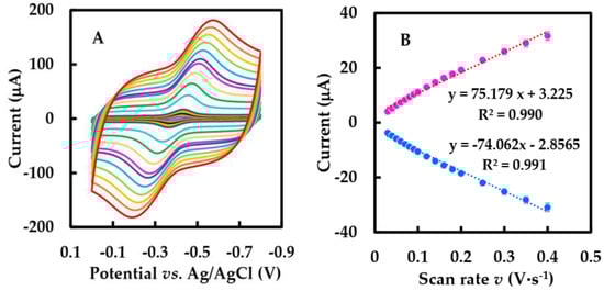 CVs of NF-GLA/MWCNTs-BSA-HFs-GOD/GCE at different scan rates in N2-saturated 50 mM, pH 6 phosphate-buffered solution are shown in Figure 5A. In Figure 5B, the relationship between peak current and scan rate was linear in the range of 0.03–0.4 V·s−1, and peak current increased by improving the scan rate. This indicates that the reaction is a surface-controlled electrochemical process.