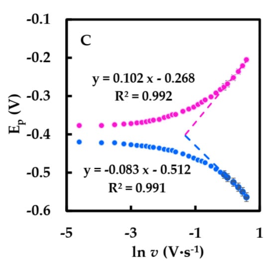The relationship between the peak potential (Ep) and the natural logarithm of the scan rate (ln v) had two straight lines with slopes of 0.102 and −0.083 (Figure 5C). Using Equation (3) based on Laviron theory in order to obtain ks at a high scan rate (within the range 0.9–1.8 V·s−1) [],