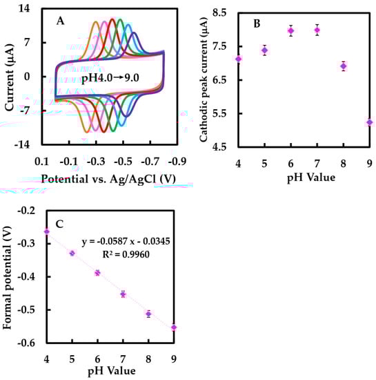 Figure 6A showed the CVs of NF/GLA-MWCNTs-BSA-HFs-GOD/GCE in N2-saturated 50 mM phosphate-buffered at different pH values. As shown in the Figure 6C, the Ep°′ was linearly related to pH with the equation of Ep°′ = −0.0587 pH − 0.0345 (R2 = 0.996). The slope value was −58.7 mV·pH−1. This value was near to the ideal Nernst value at 25 °C [], indicating that the electron transfer of GOD immobilized on NF-GLA/MWCNTS-HFS-BSA-modified GCE electrodes was the process of proton and electron equivalence.