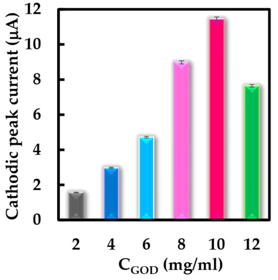 Some parameters were studied using CV to optimize the structure of the biosensor and working conditions. Firstly, the effect of the concentration of the GOD solution for NF-GLA/MWCNTs-BSA-HFs-GOD/GCE film formation in the range of 2–12 mg·mL−1 was first investigated. Figure 7 shows the cathodic peak current response of the modified electrode with different concentrations of GOD solution using CV. It was observed that modified electrode obtained the best cathodic peak current response when the concentration of GOD solution was 10 mg·mL−1. Therefore, this enzyme concentration was used for subsequent biosensor construction.