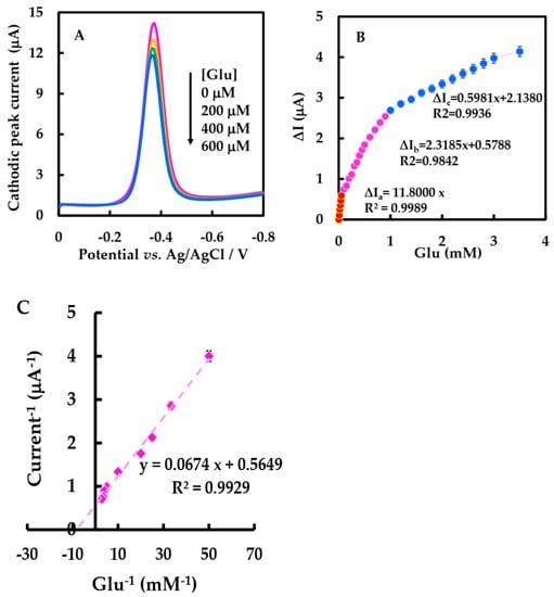 The DPV of NF-GLA/MWCNTs-BSA-HFs-GOD/GCE in the presence of Glu in air-saturated 50 mM phosphate-buffered solution was studied. The electron transfer process between the electrodes of GOD in air-saturated phosphate-buffered solution is shown Equation (6). The enzyme-catalyzed reaction of GOD with Glu when Glu was added can be shown by Equation (7). Figure 8A shows that the cathodic peak value of NF-GLA/MWCNTs-BSA-HFs-GOD/GCE decreased with the increase of glucose concentration. This is because after adding Glu into the air-saturated phosphate-buffered solution, the GOD (FAD) on the electrode surface is reduced [].