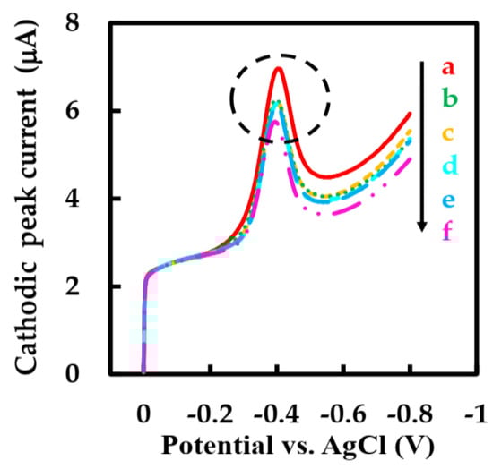 LSVs of NF-GLA/MWCNTs-BSA-HFs-GOD/GCE in blank phosphate-buffered solution (a), 1 mM Glu solution (b), and Glu solution containing 0.1 mM Vit B1 (c), Vit B1 + Vit C (d), Vit B1 + Vit C + NaCl (e), and 1.5 mM Glu solution (f) in air-saturated 50 mM phosphate-buffered solution (pH 6) at a scan rate of 0.05 V·s−1.