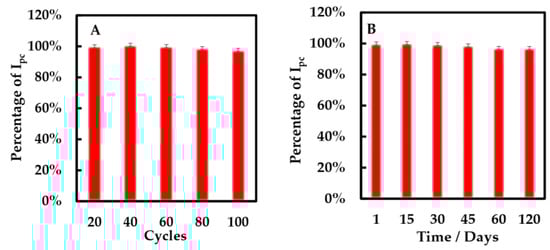 The stability of the modified electrode was researched by CV method (Figure 10A). After 100 cycles, the cathodic peak of the modified electrode only decreased 3%. Additionally, the storage stability of the biosensors was evaluated using the CV method (Figure 10B). We found that the percentage of cathodic peak current only decreased 3% when the biosensor was preserved at 4 °C for 120 days. It shows that this biosensor has excellent storage stability.
