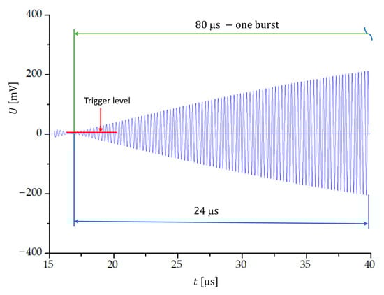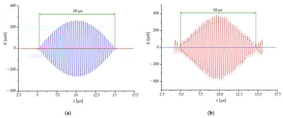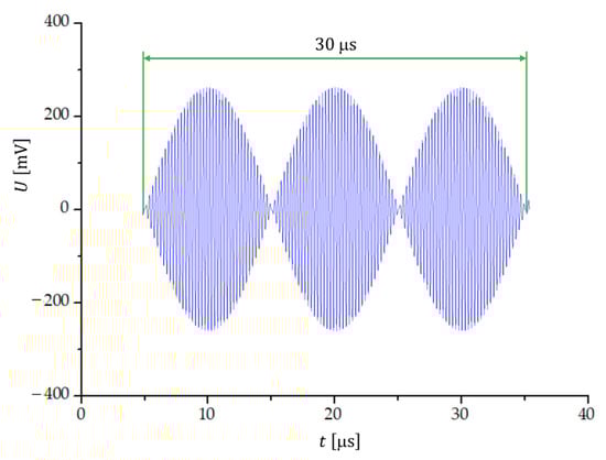 Figure 5 shows the first 24 μs of a 80 μs long beat signal obtained for two sinusoidal signals with a frequency difference at frequencies MHz and MHz. The increasing amplitude of the sinusoidal beat signal enables an accurate triggering of the measurement with respect to the threshold voltage. The number of transitions through zero within one beat period is .