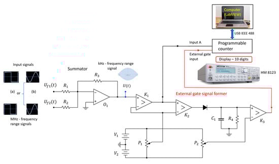 The experimental setup is shown in Figure 2. We developed a method that counts the number of transitions through zero within one beat period when frequencies and of two signals and , respectively, obtained from two quartz oscillators are temperature-compensated, both quartz crystals in oscillators have the same resonance conditions, parasitic effects are the same for both signals, the elements in both oscillators are of the same quality and both signals have the same amplitude [,,]. Sensors based on two coupled quartz oscillators were developed previously and are described in Refs. [,,]. We use a summator with an operational amplifier for summing up the two signals. The input signals can be of a sinusoidal or rectangular shape. The output voltage on the summator is for alternating signals, providing that all three resistors (see Figure 2) have the same resistance: . At the output of the summator we obtain a characteristic beat signal. The frequency of the beat signal depends on the frequency difference of the measured signals. The number of oscillations within one beat period also depends on the frequency difference between the signals and (see Equation (1)). For an accurate measurement of the number of these oscillations and for triggering the measurement we use a programmable counter HM 8123 in the external gate mode of operation, which is triggered by an external gate signal former. The output signal from the summator is connected to the input A (Channel A) of a programmable counter, where it is filtered by a low pass filter (LPF)–a chosen function in the counter–to remove possible higher frequency disturbances.