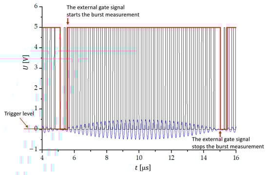 By using the external gate mode operation (Figure 2) of the programmable counter, the counting of the transitions through zero can be defined with a high accuracy []. The external gate signal former consists of a comparator , by which negative amplitudes of the beat signal are removed. At the exit of the comparator , we obtain rectangular pulses with an amplitude of 5 V (black line in Figure 2). The comparator switching level is in the range 0.5–20 mV. The signal then goes through an envelope detector (diode, , where the envelope of one beat period is filtered out. In the comparator , the switching level from low to high at the beginning of the beat and from high to low at its end is set to 2.8 V. The output of the comparator is a rectangular signal (shown red in Figure 3), which presents the external gate signal that overrides the set measurement time of the counter. The external gate function of the counter allows for a full control of the start and stop of the measurement. When EXT GATE is selected by a program, run in the LabView environment, and the control input signal is low, the counter makes all the necessary preparation for the measurement. With the high level of the gate signal, the measurement starts when the input signal triggers after a synchronization delay. The measurement stops on the first trigger after the external gate signal changes from high to low.