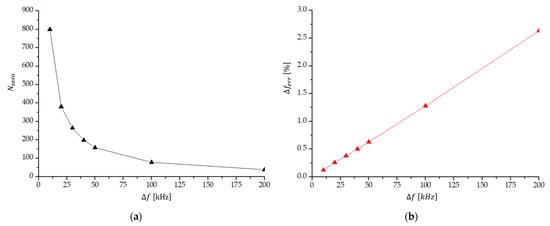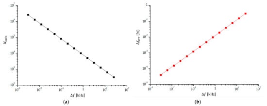 The number of transitions through zero is inversely proportional to the frequency difference (Equation (1)), which means that the number of transitions through zero steeply increases when the frequency difference decreases. Figure 6a shows the increase in the number of transitions through zero when the frequency difference reduces from 25 kHz to 6.103515 Hz and the frequency of the input signals is approximately . Because , the log-log diagram is linear. Figure 6b shows the reduction in the relative experimental error of the measured frequency difference, , which is the same as the relative error of the counted number of transitions through zero within one beat period, , assuming that the experimental error in counting the transitions through zero is always . Because and , the dependence of on is linear, but we show the dependence on the log-log diagram to make the reduction in experimental error with reduced frequency difference clearer.