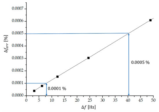Table 1 and Figure 8 show an excellent accuracy of the proposed method at low frequency differences, provided that the environmental temperature is stabilized and we use a temperature pair of quartz crystals (4 MHz) with a temperature difference of two temperature–frequency characteristics of the AT cut crystals, defined by the quartz crystal producers [], being lower than 0.001 ppm. As explained at the end of Section 2, the lower limit of the relative error of the measured frequency difference is of the order of , defined by the relative error of the measured frequencies and . This limit is reached for the frequency differences of the order of 0.1 Hz.