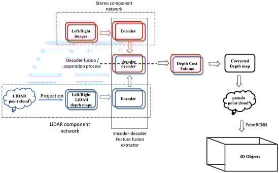SLS–Fusion is a fusion method for LiDAR and stereo cameras based on a deep neural network for the detection of 3D objects (see Figure 2). Firstly, an encoder–decoder based on a ResNet network is designed to extract and fuse left/right features from stereo camera images and project the LiDAR depth map. Secondly, the decoder network constructs a left and right depth map of optimized features through a depth cost volume model to predict the corrected depth. After the expected dense depth map is obtained, a pseudo-point cloud is generated using calibrated cameras. Finally, a LiDAR-based method for detecting 3D objects (PointRCNN []) is applied to the predicted pseudo-point cloud.