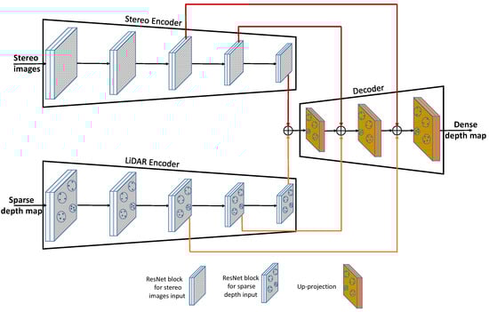 SLS–Fusion encoder–decoder architecture: The residual neural network blocks (ResNet blocks) within the encoder are used to extract features from the LiDAR and stereo inputs. The fusion process inside the decoder is accomplished through the use of addition and up-projection operators.