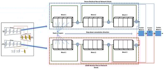 The structure of Stereo and LiDAR residual blocks inside the encoder/decoder of the SLS–Fusion model. A stack of layers is grouped into blocks for stereo and LiDAR networks, conducted by a step-down convolution direction and followed by a set of fusion blocks.