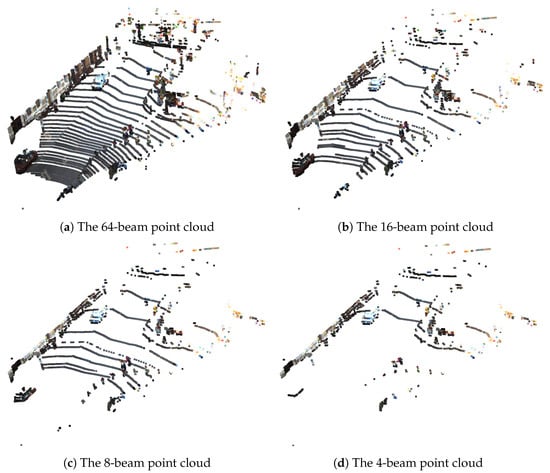 In this section, the results obtained with each component of the SLS–Fusion model (stereo camera, 4- and 64-beam LiDAR) are presented to understand the impact of each component on the ultimate detection performance of 3D objects and show how results are affected. To do this, a complete ablation study was performed by disabling each component as previously explained, or by changing the number of LiDAR model component beams. As shown in Figure 5, increasing the number of LiDAR beams will increase the number of points that represent the targets detected by the LiDAR. The aim of this illustration is to show the difficulty when dealing with LiDAR data processing. Depending on the environment, some areas are full of detected points, while others are empty. Consequently, the LiDAR contribution to the performance of the object detection model will be enhanced. However, as shown in Table 2, increasing the number of beams from 4 to 64 beams will significantly increase the cost of the LiDAR sensor. An optimized solution involves selecting the appropriate number of corresponding LiDAR beams, which can provide a desired performance level. For a more comprehensive survey of the LiDARs available on the market, the reader is referred to [].