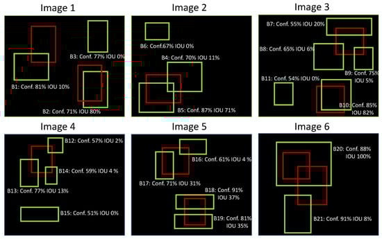 For some images, there is more than one detection overlapping a ground truth (see images 2, 3, 4, 5, 6 from Figure 6). In those cases, the predicted box with the highest IoU is considered a TP and all others as FPs (in image 2: B5 is a TP while B4 is a FP because the IoU between B5 and the ground truth is greater than the IoU between B4 and the ground truth).