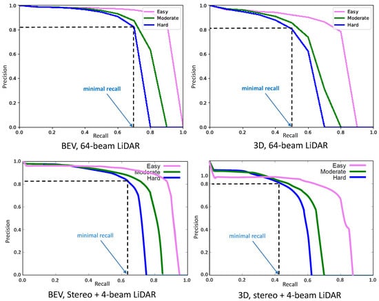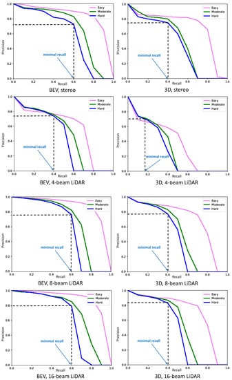 Figure 7 shows the precision–recall (P–R) curves obtained by taking into account, respectively, stereo cameras, 4-beam LiDAR, 8-beam LiDAR, 16-beam LiDAR, and 64-beam LiDAR. As shown in that figure, an object detector is considered good if its precision stays high as the recall increases, which means that only relevant objects are detected (0 false positives = high precision) when finding all ground truth objects (0 false negatives = high recall). On the other hand, a poor object detector is one that needs to increase the number of detected objects (increasing false positives = lower precision) in order to retrieve all ground truth objects (high recall). That is why the P–R curve usually starts with high precision values, decreasing as recall increases. Finally, detection results are divided into three levels of difficulty (easy, moderate, or hard) mainly depending on the dimension of the bounding box and the level of occlusion of the detected objects, especially for cars.