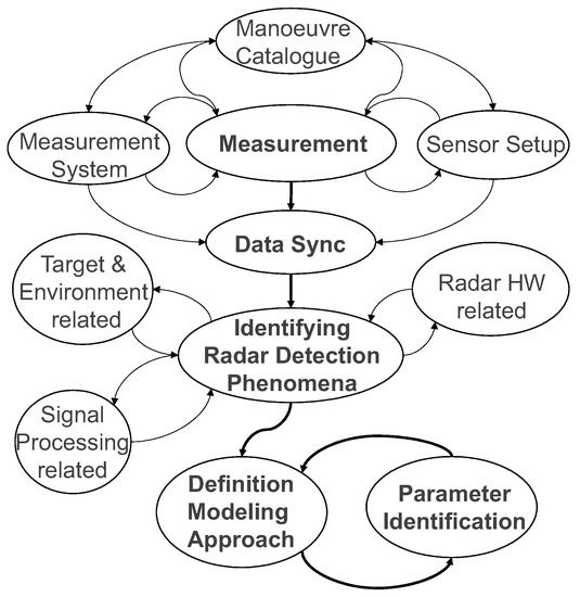 Accordingly, as shown in Figure 1, the first phase is to define and implement the measurement system and the test vehicles, followed by the definition of driving scenarios to challenge the sensors. The specific arrangement of the two automotive radar sensors, equipped with an open data interface, was also defined here to overcome the lack of confidential information through measurements and to allow for the observation of phenomena. In the second phase, the observed phenomena related to targets and environment, sensor hardware, or signal processing were identified and classified, from which the generic modular structure of the presented model was derived. Finally, in order to allow for a quantitative comparison of the simulation results, an evaluation method was proposed in the third phase.