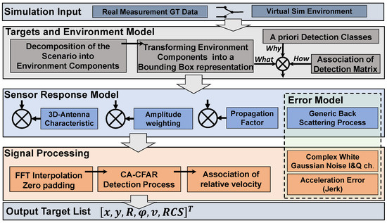 Based on our observations in accordance with our previous research [18], radar detection phenomena that can be related to some specific characteristics of the target and environmental elements (i–iii), the signal processing applied to the FMCW radar technology (iv–v), and the radar hardware (vi) are required to be implemented in the radar sensor model.