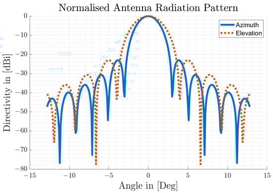 - 3D Antenna Characteristic The antenna is the coupler that transforms the EM waves of the propagating channel into current for the RF electronic components in receive mode, and vice versa in transmit mode of the radar sensor. Radar antennas are characterised by their directivity, which can be described by the antenna pattern. The ARS-308 industrial radar sensor is designed with a unique mechanically scanning antenna concept, which is a improvement of the folded parabolic antenna [50]. A prototype of a high-resolution imaging radar sensor for automotive applications with a similar narrow beam antenna concept was presented by the authors in [41]. They achieved a half-power (3 dB) beam-width of 1.6 degrees in azimuth and 4.2 degrees in elevation. According to [51] (p. 279), in order to achieve an operational antenna performance with an asymmetrical beam width and a low sidelobe level, different types of aperture antennas can be considered. In particular, a good result can be obtained for two-dimensional planar arrays in the form of a rectangular radiating surface [52] (p. 316) with cosine-weighted aperture irradiances. Certain aperture distributions (e.g., Hamming or Taylor) have a lower first sidelobe, but cosine shaping is appropriate for the modelling approach introduced here [51] (p. 232). Accordingly, the 1-D normalised antenna pattern for the cosine aperture distribution over one angular direction or plane of a rectangular aperture is calculated as follows:where the phase distribution is given by