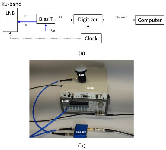 (a) Sketch of the recording chain, LNB down-convertor used without a parabolic reflector. (b) Photo of the experimental set-up.