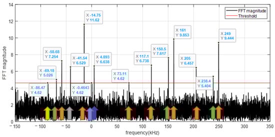 FFT magnitude centered at 11,325 MHz. The arrows of the same color indicate the tones transmitted by the same satellite. Four satellites are captured in total, with a number of tones varying from 1 to 6.