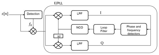 For each detected tone that is not being tracked, the signal is demodulated by the detected frequency and then supplied to the frequency and phase tracking module. The tracking process implements a third-order phase-locked loop (PLL) assisted by a second-order frequency-locked loop (FLL) []. For convenience, we refer to the PLL and FLL combination as FPLL, whose principle is as follows: An NCO (numerically controlled oscillator) generates a complex local carrier over duration T that is multiplied by a burst of the incoming signal of the same duration. The results on the real and imaginary arms are then filtered by a low-pass filter (LPF) (a summation over T, called integration time) to obtain a complex signal (), whose phase is the difference between the phase of the local carrier and the incoming tone. The resulting signal is used by a phase discriminator and by a frequency discriminator to derive the phase error and the frequency error , respectively, between the incoming carrier and the local carrier. In order to reduce noise and produce an accurate estimate of the phase and frequency of the input signal, the phase error is then filtered by a second order loop filter, , where is the natural frequency of the PLL that is related to the PLL equivalent noise bandwidth ; and the frequency error is filtered by a first order loop filter , where is the natural frequency of the FLL that is related to the FLL equivalent noise bandwidth . In the implementation, both loops share the same integrators. The FLL frequency error is injected one integrator back from the PLL, since the frequency error is in units of hertz while the phase error is in unit of cycles. The filter output is then integrated into the NCO (), which adjusts the phase and frequency of the local carrier so that they match the phase and the frequency of the incoming tone. The NCO output is then mapped to and functions, which represent an accurate replica of the incoming signal carrier. In general, since it has a large pull-in range (), the FLL is used at the beginning of the tracking process when the frequency error is large; then, after achieving frequency lock, both loops are activated until phase lock is achieved. At this time, the FLL is deactivated and only the PLL is used to keep precise carrier phase tracking. However, for applications with high dynamic stress, the FLL must be maintained over the whole tracking time. The FPLL is traditionally used to track L-band GNSS signal carriers that have a Doppler shift rate of 1 Hz/s (order of magnitude for a static user). We will show that it works for tracking LEO satellite signals in the Ku-band, which have a Doppler shift rate of a few kHz/s.