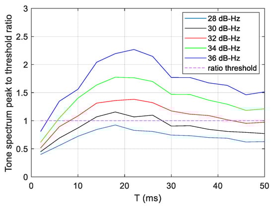 The expected weak signal level suggests that computing the FFT over a long burst would reduce the noise, however the FFT length is limited by the high-frequency shift rate. This is because over a long time interval, the tone frequency scrolls through several FFT frequency bins, and thus the signal energy is spread over many bins. In addition, long FFTs consume a lot of resources in a practical implementation. In order to select an adequate size of FFT, we computed numerical simulations of the ratio between the tone spectrum peak and the detection threshold as a function of the duration of the FFT burst, T, and for different C/No levels (Figure 4). We can verify that at the beginning, the ratio increases with T, reaches a maximum, and then decreases. The tone spectrum peak is below the detection threshold (i.e., ratio < 1) for C/No = 28 dB-Hz whatever the duration of the burst is, while for C/No higher than 30 dB-Hz, the detection becomes possible for a range of T values. For 30 dB-Hz, suitable values of T are between ~14 and 26 ms. Therefore, 14 ms is an acceptable compromise for the FFT burst duration. It should be noted that the interval of T for which the detection is possible becomes wider when the C/No increases, and in particular, the detection is possible using small values of T (down to ~4 ms for C/No = 36 dB-Hz).