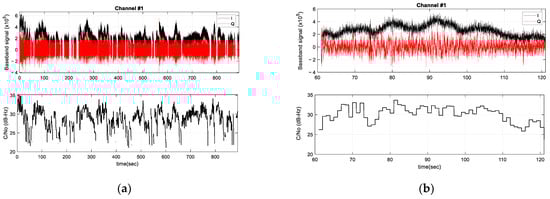 (a) Baseband signal (Phase arm (I) and Quadrature arm (Q)) and estimated C/No of the successively received satellite tones; (b) Zoom in showing a low signal level at the start and end times of satellite tracking, a high signal envelope at high satellite elevations, and a signal amplitude oscillation at low frequency (~0.1 Hz).