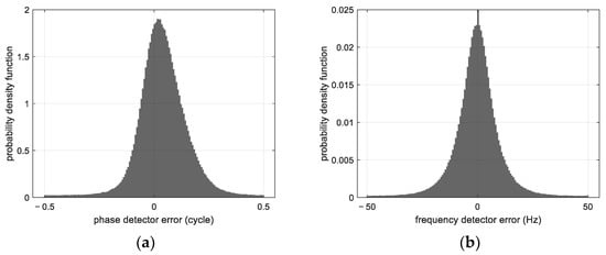 (a) Probability density function of the phase detector error, (b) Probability density function of the frequency detector error.